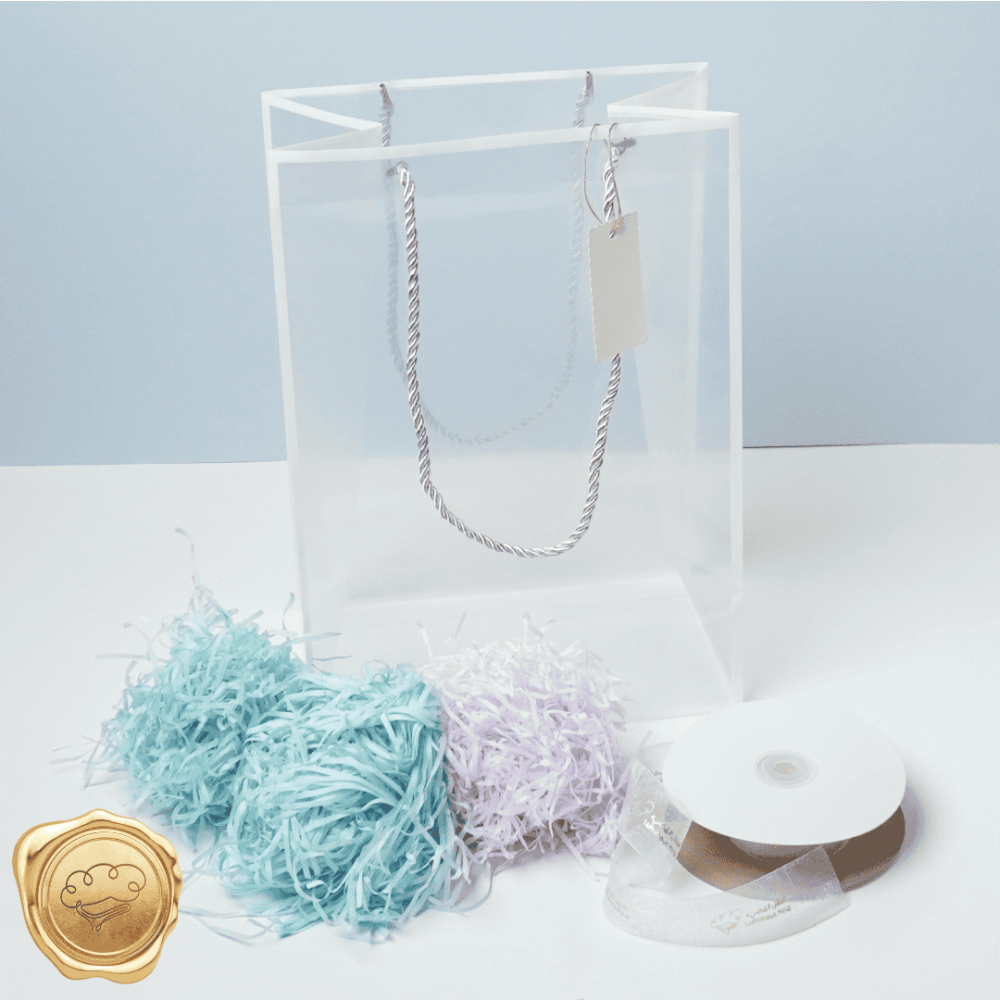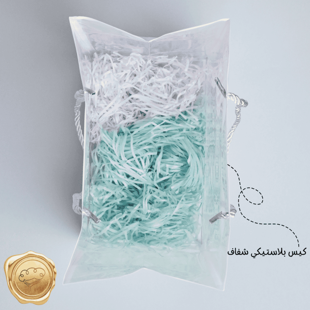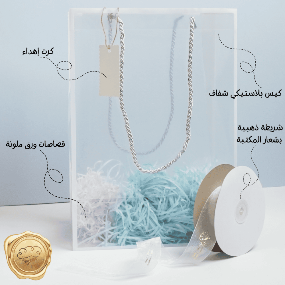 - كيس شفاف مقاس 35×24.5سم .. يشمل (قصاصات ورق ملونة+شريطة+كرت بسيط)