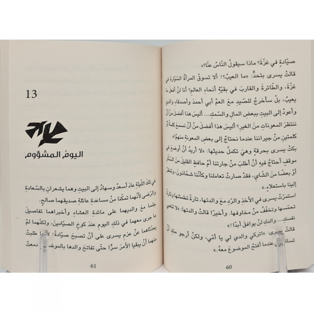 قصة: تغريد النجار، رسوم: غلنار حاجو. بعد عدة حوادث أليمة تصيب عائلة يسرى يتغير مجرى حياة العائلة إلى الأبد٬ تصبح يسرى ـ ذات الخمسة عشر عامًا ـ على مفترق طرق… فإمّا أن ترضى بحياتها الجديدة وإما أن تأخذ زمام الأمور بيدها وتقوم بفعل شيء ما لتغييرها.لكن… ماذا لو أن قيامها بهذا الشيء سيكون ضد أعراف وتقاليد المجتمع؟ ماذا سيحدث لو قامت بعمل خارج عن المألوف في عيون الناس؟ وماذا لو أن قيامها بهذا الشيء سيقودها لاكتشاف أحد أهم أسرار الحياة؟ تدور أحداث القصة في غزة- فلسطين، وهي مستوحاة من قصة حقيقية. هذه الرواية ستلهم قراءها وتبعث بصيصًا من الأمل في نفوسهم.