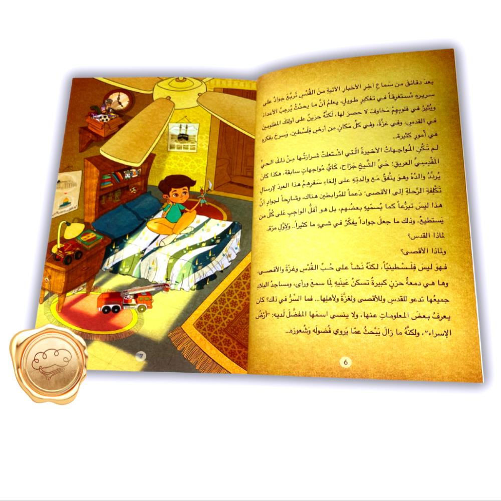 في رحلة مشوقة تنطلق مع جواد من الخليل إلى بيت لحم ثم إلى القدس الشريف، تتكشف أسرار مدينة تسكن القلوب قبل الخرائط. حجر وشجر يرويان حكايات الثبات، وصرة قماشية تقود إلى خريطة مضيئة، وأسئلة تتفتح في كل خطوة نحو الأقصى المبارك. يكتشف جواد معنى قدسية المكان، وما كلمة السر التي تفتح أبواب الحرم الشريف، ولماذا تبقى القدس قضيتنا جميعا عبر الزمن. قصة تلهم اليافعين وتوقظ فيهم حب الأرض والحق والانتماء.