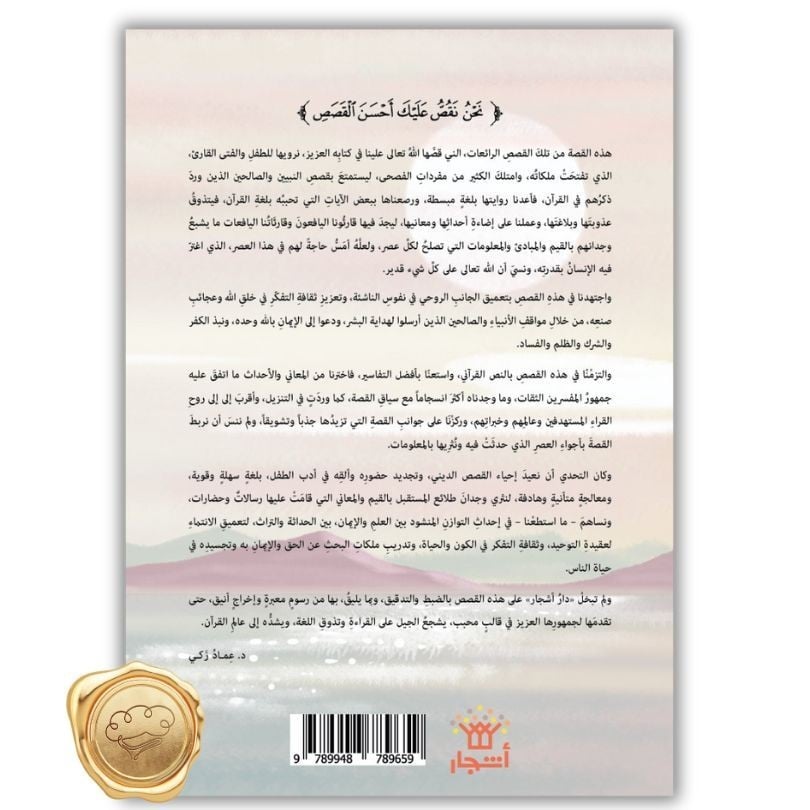 هذه القصة من تلك القصص الرائعات، التي قصّها الله تعالى علينا في كتابه العزيز، ونرويها للطفل والفتى القارئ الذي تفتحت ملكاته وامتلك الكثير من مفردات الفصحى، ليستمتع بقصص النبيين والصالحين الذين ورد ذكرهم في القرآن، فأعدنا روايتها بلغة مبسطة ورصعناها ببعض الآيات التى تحببه بلغة القرآن. واجتهدنا في هذه القصص بتعميق الجانب الروحي في نفوس الناشئة وتعزيز ثقافة التفكر في خلق الله وعجائب صنعه من خلال مواقف الأنبياء والصالحين الذين أرسلو لهداية البشر، ودعو إلى الإيمان بالله وحده، ونبذ الكفر والشرك والظلم والفساد.