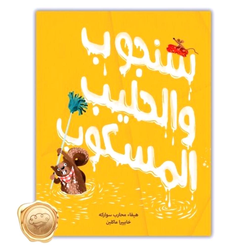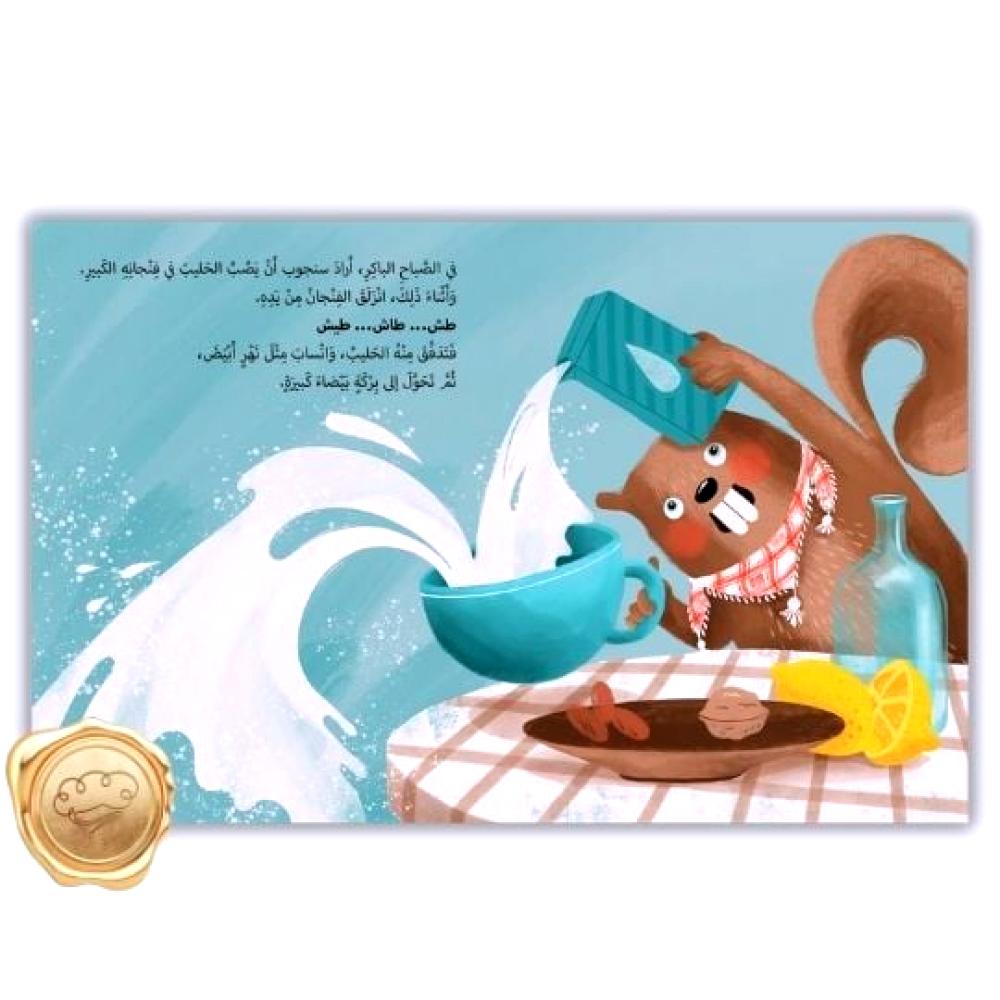 ينزلق فنجان الحليب من يد سنجوب فتتشكّل بركة بيضاء على الأرض. يحاول سنجوب أن يتهرّب من فعلته، لكنّ بابا سنجوب يخبره بأن بركة الحليب على الأرض ستخبره عن الفاعل الذي سيقوم بدوره بتنظيف الأرض. تحمل هذه القصة بين صفحاتها خطابًا مزدوجًا؛ فهي تتوجه إلى الطفل وإلى البالغ على حدّ سواء، فهي تتوجّه إلى الطفل في هذه الفئة العمرية المبكّرة الذي لا يعترف بالخطأ ويحيله في الغالب إلى شخص ما، وإلى البالغ الذي تنصحه بشكل غير مباشر بالطريقة التي يجب أن يتعامل بها مع الطفل في مثل هذه الحالة. وذلك لأن الحدود بين الصواب والخطأ في عمره المبكّر ما تزال خارج نطاق إدراكه، وهو يتعامل مع "الأخطاء" وفق "معاييره "الطفولية " وغالبا ما يكون "الخطأ" في معايير الطفل مسليّا أكثر.