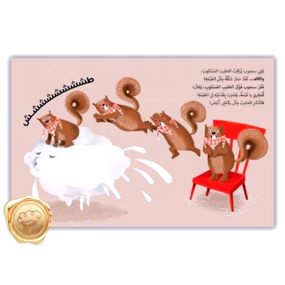 فجأة، ينزلق الفنجان من يد سنجوب، فينسكب منه الحليب ويتحوّل إلى بركة بيضاء. يحاول سنجوب أن يتهرّب من المأزق الّذي وقع فيه، ولكن بابا سنجاب يخبره عن حكاية قديمة ستكشف عن الشّخص الّذي سكب الحليب. هل سيعترف سنجوب بفعلته؟ والأهمّ من هذا… هل سينظّف الحليب المسكوب على الأرض؟