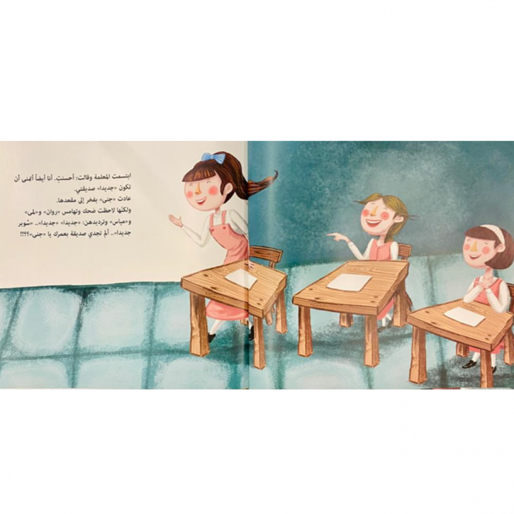 في قصة " سوبر جديدا " تتعرض جنى للتنمر من بعض زميلاتها في المدرسة لأنها صرحت أن صديقتها المفضلة هي جدتها! الأمر الذي وجدته بقية الفتيات يدعو الاستهزاء والضحك.