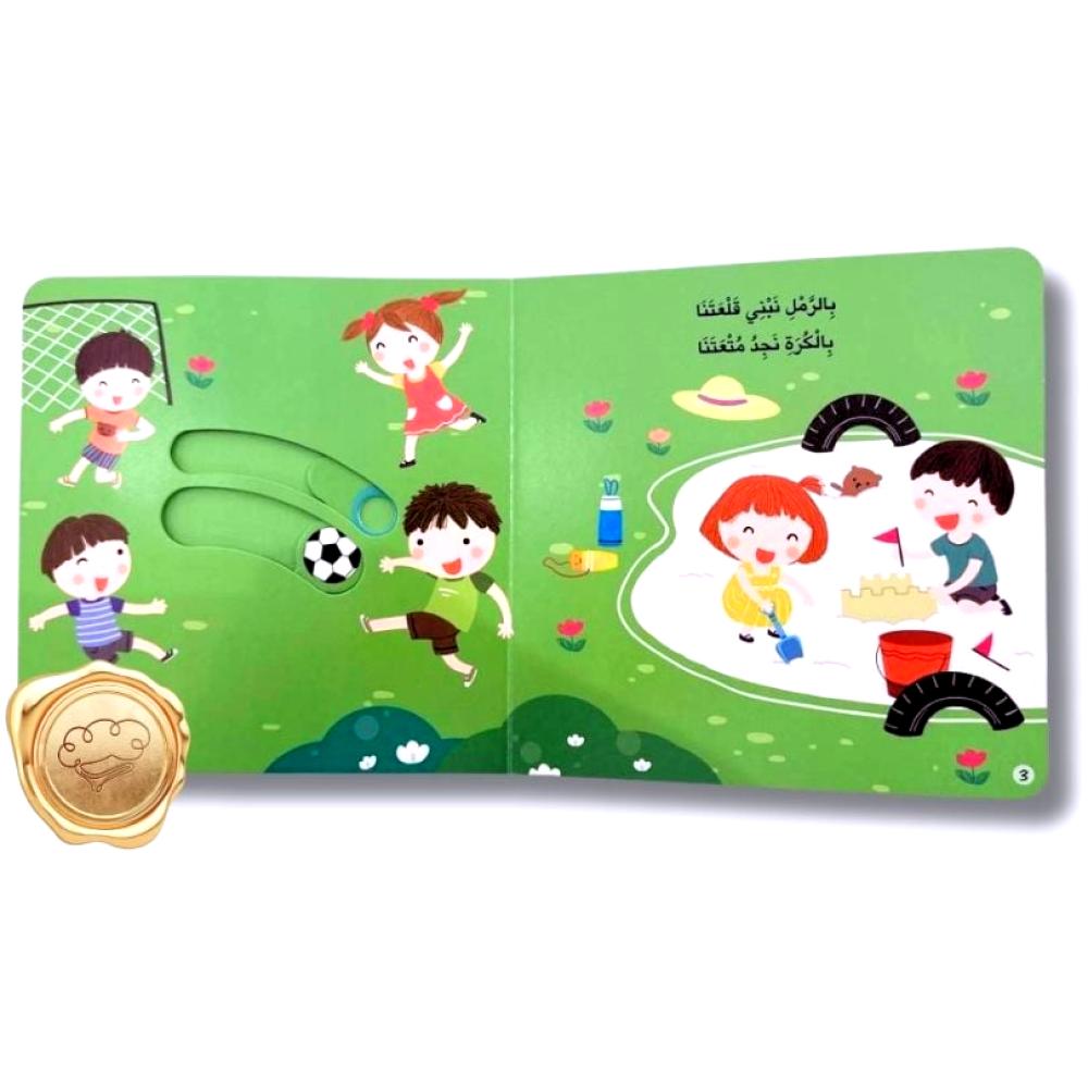 أحداث يومية بسيطة بطريقة عرض إبداعية حيث الرسومات الجذابة والقطع المتحركة ليتفاعل الطفل ويلعب أثناء القراءة .
