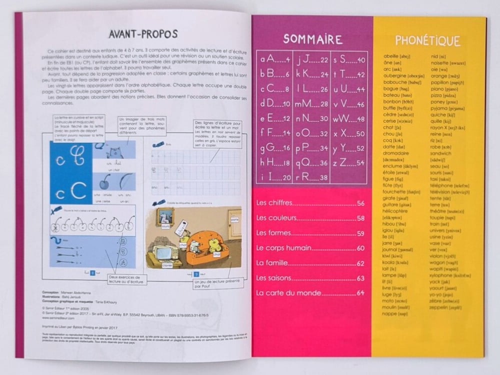 Les lettres apparaissent par ordre alphabétique. Chaque lettre occupe une double page. Les dernières pages abordent des notions précises : les chiffres, les couleurs, les formes, les saisons, la famille et le corps humain.